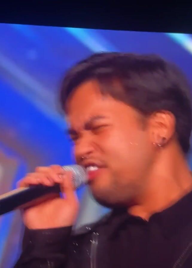 A man with dark hair is singing into a microphone. He has an eyebrow piercing and a nose ring. He is wearing a black shirt and a black jacket. The background is a blue and gold star pattern. The video is from a show called "Britain's Got Talent". The title of the video is "Matty Juniosa turns Prince 'Purple Rain' GOLDEN! Auditions | BGT 2026".