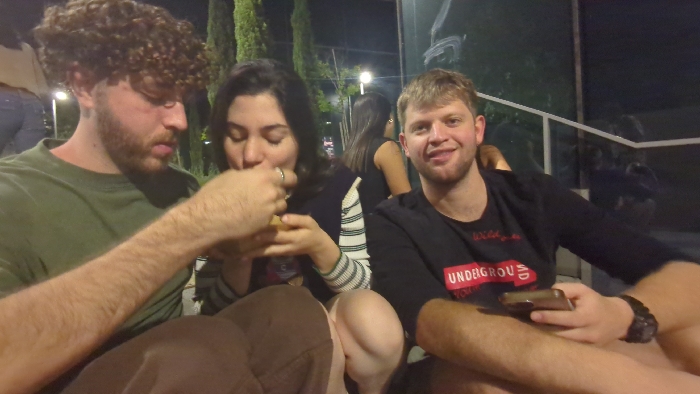 A nighttime image depicts three individuals in the foreground of an urban outdoor or semi-outdoor setting. The precise location within Modiin-Maccabim-Reut, Israel, is not discernible from the visual evidence. From left to right: 1. A male with curly brown hair and a beard, dressed in an olive-green long-sleeved shirt and brown pants, looks downward. His right arm is visible, and his hands are positioned close to the mouth of the central female, suggesting an interaction involving a small object or food item. 2. A female with dark hair, wearing a dark vest over a white and dark-striped long-sleeved shirt, also looks downward. Her hands are near her mouth, engaging with the object. She wears a ring on her left ring finger. 3. A male with short, light-colored hair and a clean-shaven face, wearing a black long-sleeved shirt with red lettering that includes "UNDERGROUND," looks directly at the camera and smiles. He holds a dark-colored smartphone in his left hand and wears a dark watch on his left wrist. In the mid-ground, partially obscured behind the central female, a fourth individual, a female with long dark hair wearing a dark top, is visible facing away from the camera. The background features tall dark trees, visible streetlights, and reflections on a dark vertical surface, possibly a window or building, with a white railing visible behind the rightmost male. The scene is illuminated by artificial light sources.