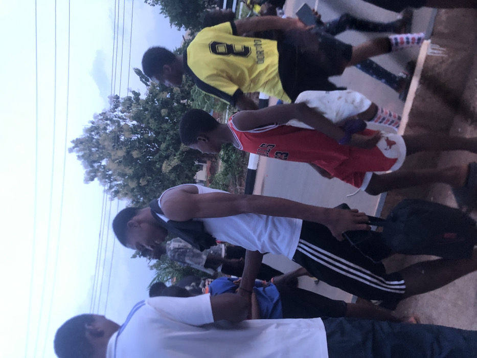 The image captures an outdoor scene featuring multiple individuals, predominantly males, in Nsugbe, Nigeria, under an overcast sky. In the mid-ground, a male subject wearing a white tank top, black athletic shorts with three white stripes, and a black cloth draped over his left shoulder is seen smiling while holding a black bag in his left hand. To his immediate right, a younger male subject wears a red Chicago Bulls basketball jersey with the number "23" and matching shorts, carrying white and purple items in his left hand. Further to the right, a male subject is visible wearing a yellow and black soccer jersey with "DORTMUND" and the number "8" on the back, holding a smartphone in his left hand. A portion of another male subject, wearing a white shirt with blue accents, is in the left foreground, facing away from the camera. Additional blurred figures are present in the background, suggesting a gathering. The environment consists of a paved surface with a low concrete curb marked by a white stripe, large green trees with light-colored foliage in the background, and utility lines crossing the upper portion of the frame. Distant structures are faintly discernible behind the trees.