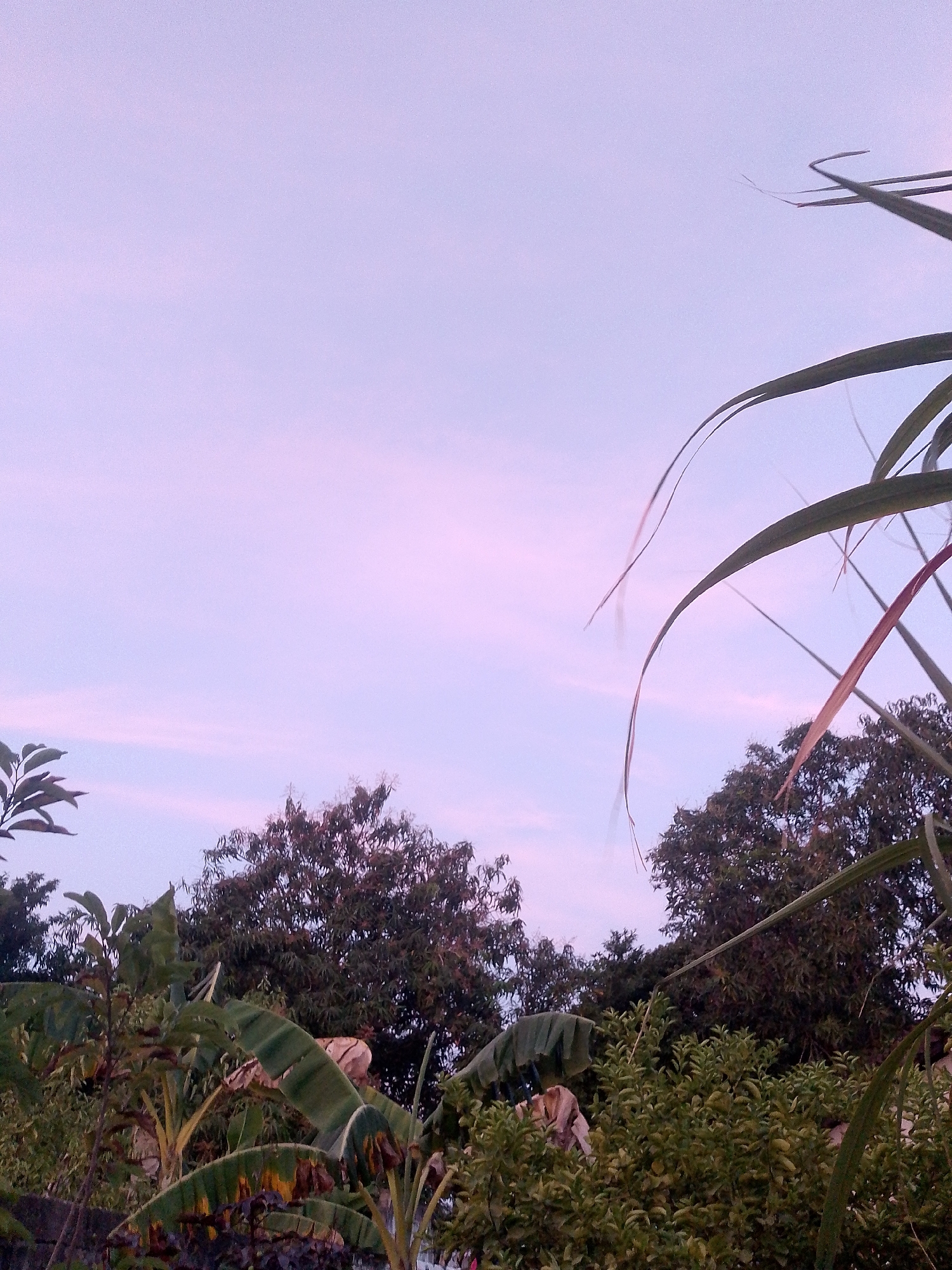 The image depicts a view in Juan Griego, Venezuela, taken at either dawn or dusk. The sky is a soft pink and purple hue, suggesting twilight hours. In the foreground are various types of foliage, including banana trees with some browned or damaged leaves. Other leafy plants and trees obscure the middle ground, appearing dense and green. Tall, thin blades of grass or other similar plants are prominent in the right foreground, some partially obscuring the view of the sky and trees behind. The general scene gives the impression of a tropical or subtropical environment.