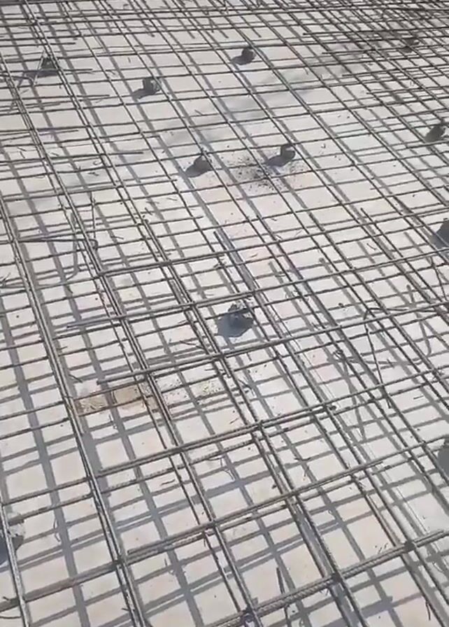 The scene showcases a construction site, possibly the foundation or floor of a building, where a grid of steel rebar is laid out