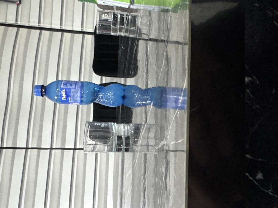 An indoor scene is depicted within the city of Vokil, Bulgaria. A dark gray/black marbled tabletop dominates the foreground, exhibiting a polished, reflective surface. On the tabletop, positioned left to right, are: one clear, empty drinking glass with a thick base, marked with faint 'G' or '2006' lettering; one blue plastic Fanta bottle, partially filled with light blue liquid, exhibiting condensation, with its label facing the viewer; and one clear, empty drinking glass with a thick base, bearing 'G Grann' lettering. All three objects cast distinct reflections on the table surface. The dark, upholstered backs of two chairs are partially visible behind the table; one is behind the left drinking glass, and the other is behind the Fanta bottle and right drinking glass. A portion of a green object is visible on the far right edge of the tabletop. The background features horizontal blinds with alternating light gray and white stripes, bisected by a thin vertical cord on the left. No individuals are present in the frame.