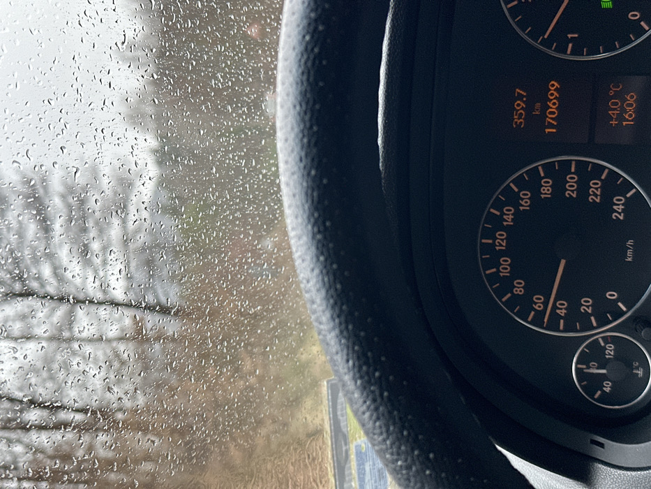 This image depicts a first-person view from inside a moving vehicle in Lovtsi, Bulgaria, during a rainy, overcast day. The upper half of the frame is dominated by a windshield heavily covered in raindrops, obscuring a view of bare deciduous trees and distant vegetation, consistent with a late autumn or winter season. Through the lower left of the windshield, a wet, unpaved road or dirt track is visible. The lower third of the image shows the top section of a black, textured steering wheel and a partial view of the instrument cluster. The speedometer indicates a speed of approximately 50 km/h. A digital display within the cluster shows a trip distance of 359.7 km, a total odometer reading of 170,699 km, an ambient temperature of +4.0 °C, and the time as 16:06. No individuals are visible.