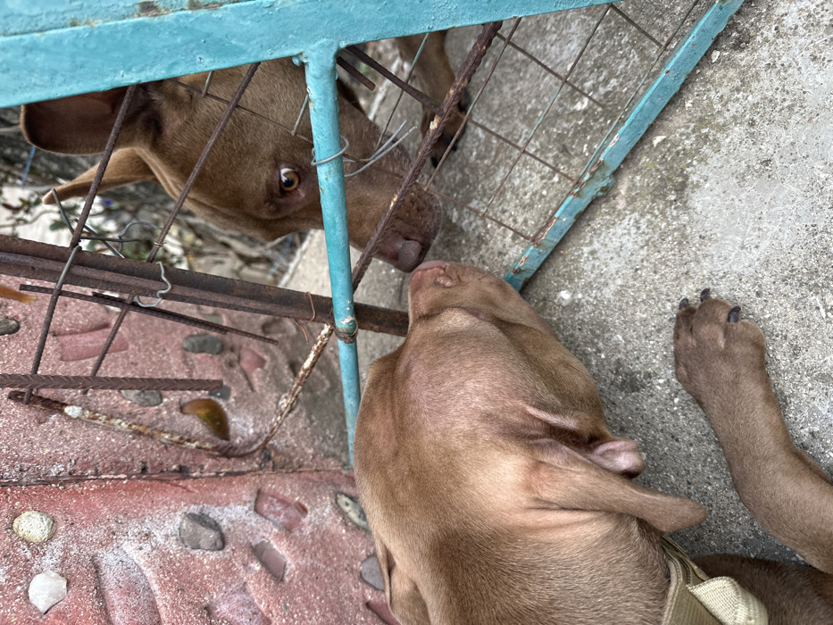 - "The image depicts two brown-coated dogs interacting through a deteriorating metal fence on a light grey concrete surface in Malevo, Bulgaria" by FM-gsE632, licensed under CC BY 4.0
