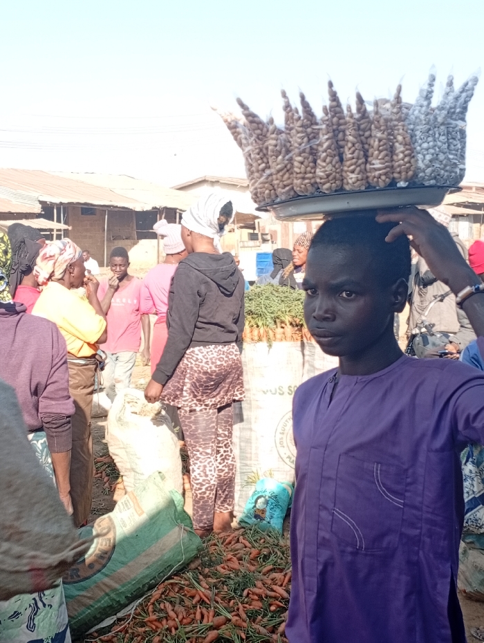 The image presents an outdoor market scene in Jos, Nigeria, during daylight hours. A young individual, likely a boy, stands prominently in the right foreground, wearing a dark purple tunic. He is balancing a flat, round metal tray on his head, which holds approximately fifteen clear plastic bags containing shelled groundnuts, some light brown and some off-white. His left hand is raised, appearing to steady the tray, and a beaded bracelet is visible on his wrist. Adjacent to the young person, a substantial quantity of fresh carrots, many with green leafy tops, is piled directly on the ground. Several large woven sacks are scattered among the carrots, including a white sack partially labeled "JOS SOUTH" and a green sack. In the midground, a group of adults is visible. One woman, wearing a yellow top and a patterned headwrap, appears to be conversing with a man in a pink t-shirt. Another woman, seen from behind, wears a black hoodie, leopard-print leggings, and a white headwrap. Other figures are interspersed throughout the market space. The background consists of simple, unpainted concrete block buildings topped with corrugated metal roofs, indicative of informal market stalls or auxiliary structures. The sky above is clear and bright. The scene suggests an active commercial environment focused on agricultural produce.