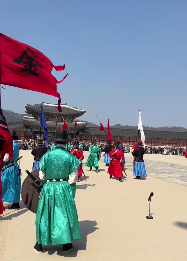 - "group of performers, dressed in colorful traditional Korean military attire, walking in formation across a large, sandy courtyard" by FM-LQAZF2, licensed under CC BY 4.0