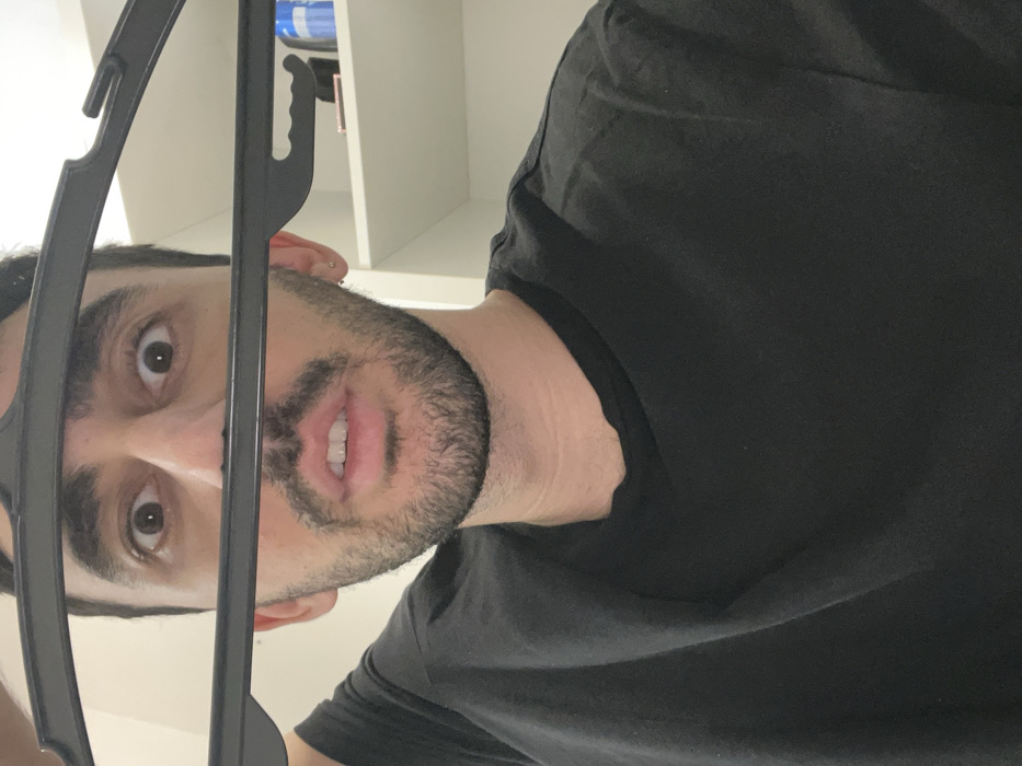 A male individual is depicted in a close-up, chest-up indoor shot, located in Modiin-Maccabim-Reut, Israel. He has dark hair, a beard, and a light complexion, with a small stud earring visible in his left ear. He wears a plain black t-shirt. A black plastic clothes hanger is held horizontally across his face, positioned below his eyes and above his mouth, with the top bar obscuring his nose and the bottom bar bisecting his mouth. His eyes are wide open, and his mouth is slightly agape, revealing teeth. He is looking directly at the camera. The background consists of a light-colored wall on the left and white shelving units on the right, with indistinct items visible on one shelf.