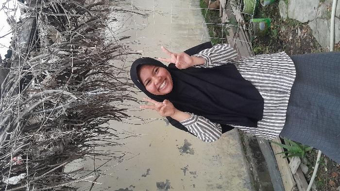 A single female subject is depicted outdoors in Lhokseumawe, Indonesia. She is a young adult with a warm skin tone, wearing a black hijab, a long-sleeved shirt with vertical black and white stripes, and a dark grey plaid skirt. She is smiling broadly with visible teeth, and both hands are raised to shoulder level, each forming a "V" sign with the index and middle fingers. Behind the subject is a light-colored wall exhibiting signs of wear, discoloration, and peeling paint. Above the wall and the subject's head is an overhead structure composed of dried, brown, and grey organic material, resembling intertwined palm fronds or similar vegetation, with thin metallic wires visible within it. The ground in the lower right foreground consists of dirt with small green plants cultivated in repurposed plastic containers, alongside a white pipe or hose. To the lower left, an aloe vera plant and horizontally stacked wooden planks are present. The scene is illuminated by natural daylight.