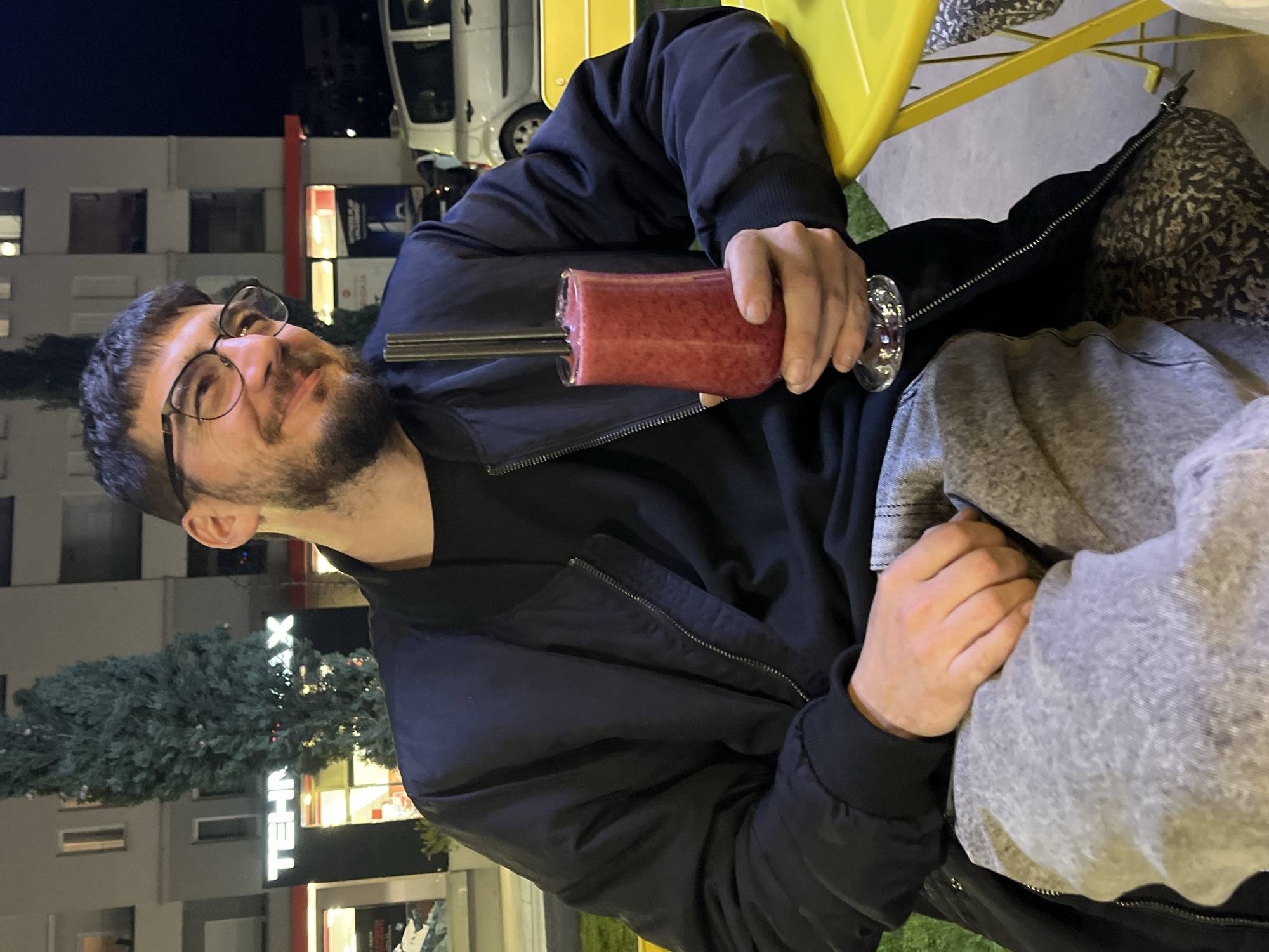 A male individual, approximately 20-35 years old, with short dark hair, a beard, and dark-rimmed glasses, is seated outdoors at night. He wears a black bomber jacket over a black long-sleeved shirt and light grey textured pants. He is smiling, looking slightly upward and to his right. His left hand holds a clear stemmed glass containing a reddish-pink blended beverage with two dark straws, resting on a bright yellow outdoor table. The background includes a tall evergreen tree to the left and a multi-story building with illuminated windows. A partially visible, illuminated sign reading "TEHNOMAX" is present on the ground floor of a building behind him, confirming the location in Budva, Montenegro. To the right of the subject, a light-colored hatchback car is parked on what appears to be a street.