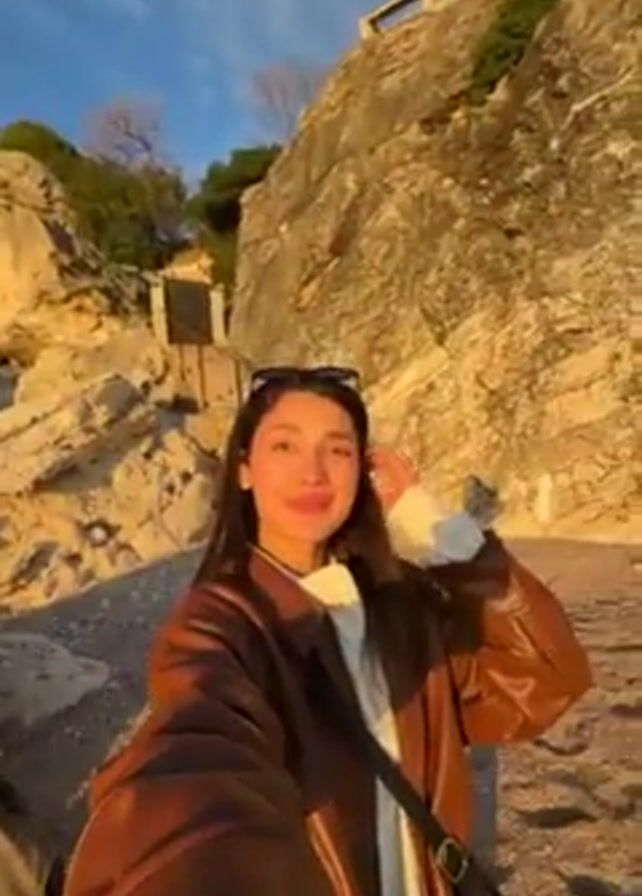 Two young women are on a beach. One woman with long dark hair is holding the camera, taking a selfie video. She is wearing a brown leather jacket, a white sweater, and sunglasses perched on her head. She has a black purse with a gold circular detail on the strap slung over her shoulder. She smiles and looks around at the scenery. The other woman, also with long dark hair, is wearing a red and black striped sweater. The beach has golden sand and is bordered by large, light-colored rocks and cliffs. Atop the cliffs is a building with a balcony. The sky is blue with some wispy clouds. The sun is setting, casting a warm glow on the scene. The second woman approaches the first, puts her arm around her, and poses for the selfie.