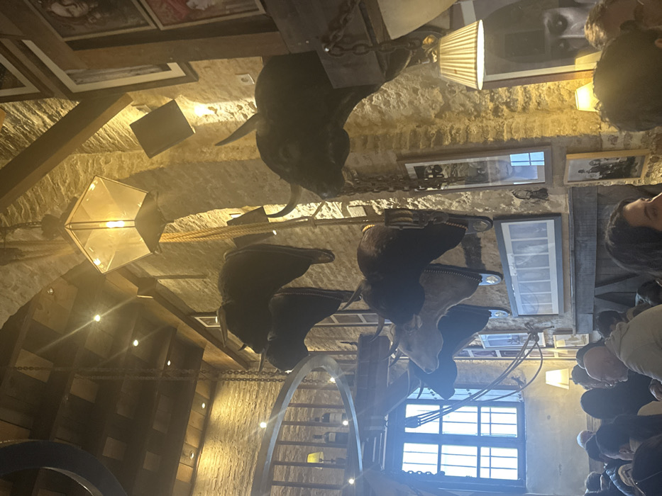This image depicts the interior of a traditional Spanish establishment, likely Bodeguita Romero in Sevilla, Spain, given the distinctive bullfighting theme and rustic architecture. The scene is dominated by rough-hewn light-colored stone walls and heavy dark wooden ceiling beams, creating a warm, historic ambiance. Numerous taxidermied bull heads are mounted on the walls; at least seven are distinctly visible, primarily dark brown or black, with prominent horns, some appearing lighter in color. Heavy metal chains hang from the ceiling and are integrated into the decor, supporting some elements. Illumination comes from various sources: a large, multi-faceted lantern with an exposed bulb hangs centrally, spotlights are recessed into the wooden ceiling, and wall-mounted lamps with pleated shades provide additional light. Various framed artworks and photographs, including portraits and what appear to be bullfighting scenes, adorn the stone walls. A large window with white muntins on the left side allows natural light into the space. On the far left, a curved wooden railing suggests a mezzanine or a decorative architectural feature, with bottles visible on a shelf below it. The lower portion of the image shows a crowd of people, primarily seated at tables, suggesting a dining or social gathering. Individuals are engaged in conversation, with some faces partially visible, indicating a lively, bustling atmosphere. No specific actions or interactions beyond general social engagement are clearly discernible.