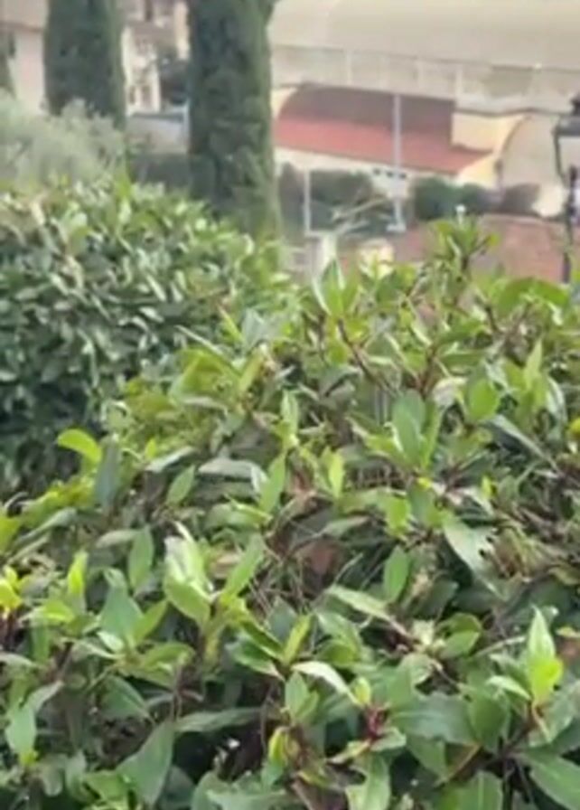 From a low vantage point overlooking dense greenery, a cityscape emerges. Tall, slender cypress trees punctuate the landscape, reaching towards a slightly overcast sky. In the distance, buildings with red-tiled roofs and a large, light-colored structure stand out. A vintage-style street lamp is visible, adding to the classic urban scene.