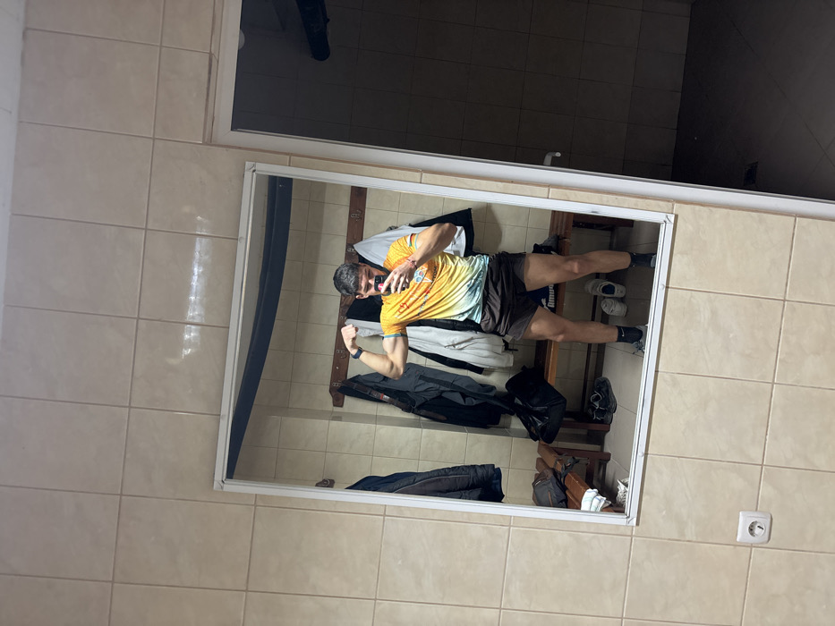 The image depicts a single male subject captured in a mirror selfie within an indoor changing room located in Zlatograd, Bulgaria. The subject, a male with short dark hair and facial stubble, stands facing the large rectangular mirror framed in white. He is wearing a short-sleeved athletic shirt with a multi-colored gradient design (yellow, orange, white, and blue), dark brown or black athletic shorts, dark socks, and white athletic shoes with black accents. A dark-colored watch or fitness tracker is visible on his left wrist. He is actively posing by flexing his left bicep while holding a black smartphone in his right hand, pointed towards the mirror, capturing his reflection. The background reflected in the mirror reveals the changing room environment: light brown or beige square tiles cover the walls. A wooden bench runs along the back wall, beneath a row of metal coat hooks. Several articles of clothing, including dark jackets and hoodies, are hanging on these hooks. On the bench, to the subject's left, a dark duffel bag, a folded white towel, and a pair of dark athletic shoes are visible. To the subject's right, a pair of light-colored slides or sneakers rests on the floor below the bench. Outside the mirror's frame, the immediate environment consists of matching light brown or beige square tiled walls. A white electrical outlet with two circular sockets is visible on the wall to the lower left of the mirror. To the right of the mirror, a dark doorway or opening leads into an adjacent, dimly lit room, which also appears to have tiled walls.