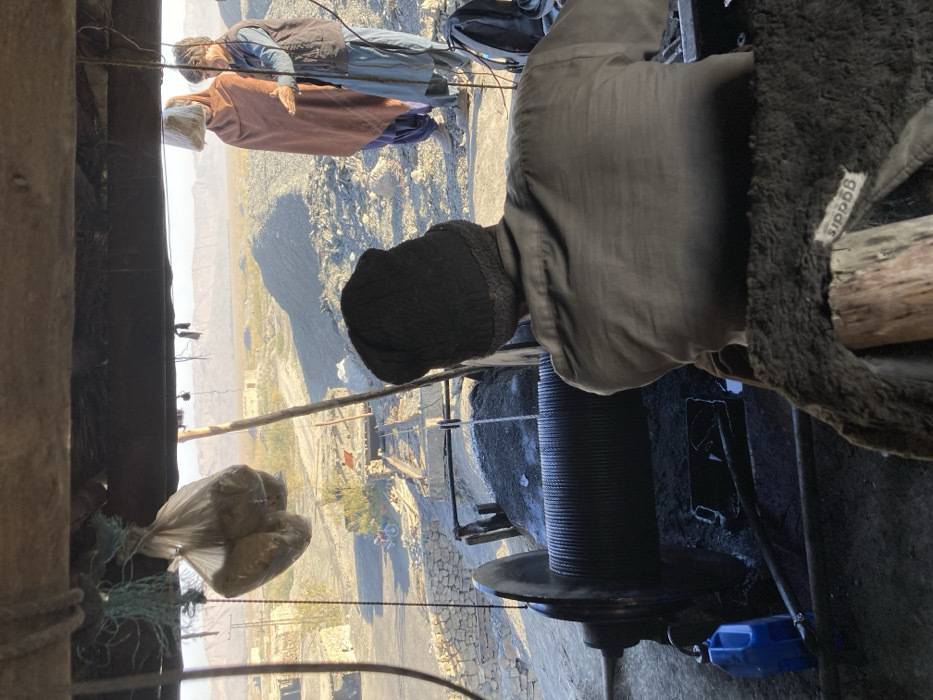 The image depicts an outdoor industrial setting in Duki, Pakistan, observed from inside a rudimentary shelter under bright daylight. In the immediate foreground, a person, viewed from the back, wears a dark beanie and a grey long-sleeved shirt, positioned at a large, horizontal metal winch. The winch is heavily spooled with wire rope and covered in dark, granular residue. A blue plastic jerrycan rests on the ground beside the winch. Above, a translucent plastic bag containing light-colored contents and some dark netting hang from a wooden beam. Outside the shelter, in the midground, two individuals stand on dusty terrain near large piles of dark, granular material. One person is clad in a reddish-brown full-body wrap and blue trousers, facing the second individual. The second person wears a light blue shalwar kameez and a dark vest, gesturing with their right hand. A black backpack is visible at their feet. A narrow-gauge track extends into a lower area where a paved road and a red motorcycle are visible on the left. The background reveals an arid, mountainous landscape with scattered low-rise structures and sparse vegetation under a clear sky.