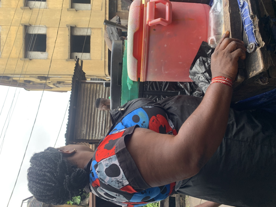 The image depicts an outdoor urban scene in Nkpor, Nigeria, under an overcast sky. In the foreground, an adult female is positioned with her back partially to the viewer, facing right. She has dark skin, braided dark hair styled into a bun, and wears a small gold stud earring on her right ear. Her attire consists of a black apron worn over a short-sleeved top featuring a black, blue, red, and white patterned design, with a collar and a visible zipper on the left chest. Her right forearm rests on a weathered wooden surface, and she wears multiple red and white beaded bracelets on her right wrist. To her right, on the wooden surface, is a red plastic insulated container with handles, appearing to contain a reddish liquid or food substance. A crumpled black plastic bag is situated between her arm and the red container. Behind the red container, a green and black plastic container is partially visible. A clear plastic bottle is also present on the wooden surface. In the mid-ground, a young male individual with a faded haircut is partially visible behind the containers, facing away from the camera. To the left of this individual, a corrugated metal structure with a sloped roof is present. In the background, a multi-story building with a yellow/ochre facade is visible, featuring multiple open rectangular window frames that appear unglazed. Electrical wires are suspended against the cloudy sky.
