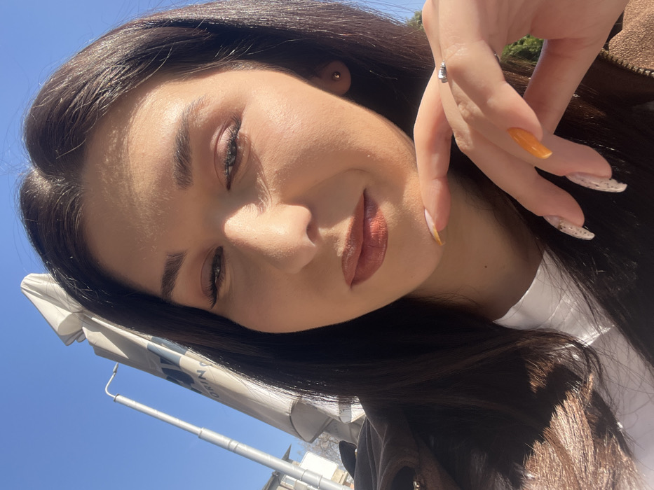 The image presents a close-up, high-angle portrait of a female individual outdoors under direct sunlight. The subject has long, dark brown hair, an oval face, and light-to-medium skin tone, with visible makeup including winged eyeliner and reddish-brown lipstick. Her eyes are partially closed, and a small circular stud is visible in her right earlobe. She wears a white top beneath a brown outer garment. Her left hand, adorned with manicured nails (one orange, others light with speckles) and a ring on the ring finger, is positioned beneath her chin. In the background, a large, light-colored outdoor umbrella or canopy is visible against a clear blue sky. Partial Cyrillic text on the umbrella is discernible, including "БАР" and "ТОРИН". To the left of the umbrella, a tall metallic pole is present, with a faint light-colored building structure beyond it. The scene depicts an outdoor cafe or bar setting. This specific detail of "Bar Torin" identifies the location as Bar Torin, situated at ul. "Knyaz Alexander I" 44, within the Tsentar district of Plovdiv, Bulgaria.