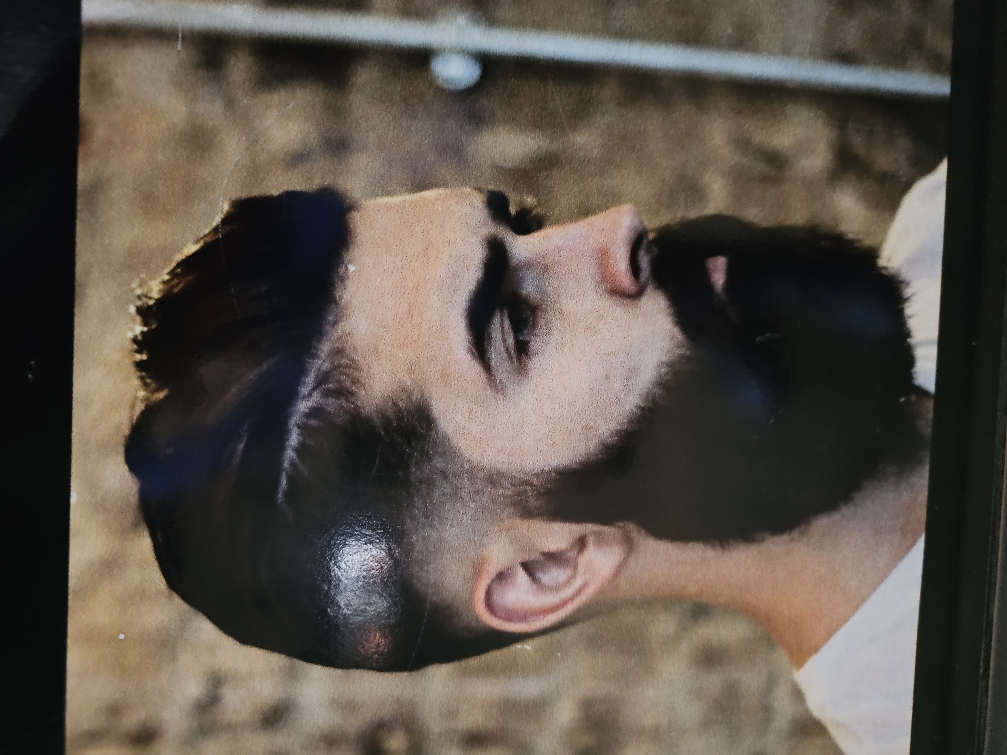 A photograph, taken from a slightly elevated angle, displays a screen or printed image presented in Stara Zagora, Bulgaria. The primary subject is an adult male depicted in profile, facing towards the right. He has fair skin and a modern dark haircut featuring a high skin fade on the sides transitioning to longer, slicked-back hair on top. A sharp part line is visible on his left side, and a faint blue tint is observable within the slicked-back hair. The male possesses prominent dark eyebrows, dark eyes, and a full, dense, dark beard, meticulously groomed, covering his jawline and chin. He is wearing a white crew-neck shirt, with the collar and upper shoulder visible. The background consists of a textured, light brown wall, possibly brick or rough plaster. On the right side of the background, a thin, vertical light-colored object with a small, circular attachment is partially visible. The overall image is framed by black borders at the top and bottom, indicating it is a photograph of a display.