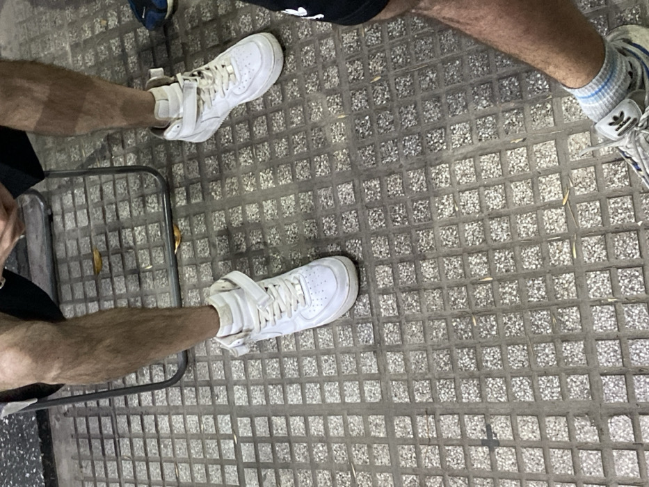 The image depicts an outdoor ground-level view in San Antonio de Padua, Argentina. The scene focuses primarily on the lower extremities of two individuals seated on a grey, square-patterned paved surface composed of exposed aggregate tiles. The central figure, positioned slightly to the left, is a male with visible bare, hairy legs wearing dark shorts. This individual is seated on a dark, thin-framed metal chair, with their feet clad in white high-top sneakers featuring a prominent ankle strap and white laces. The hands, partially visible at the top of the frame, suggest the person is holding or interacting with a mobile phone. To the lower right, the bare, hairy leg of a second male individual is visible. This person is wearing black shorts, a grey athletic shoe with visible Adidas branding, and blue and white striped socks. The paved ground surface is generally grey with some visible dirt and scattered dry, light-colored leaf debris. The lighting is even, suggesting an outdoor environment during daytime or under bright artificial light. No explicit interactions between individuals are visible.