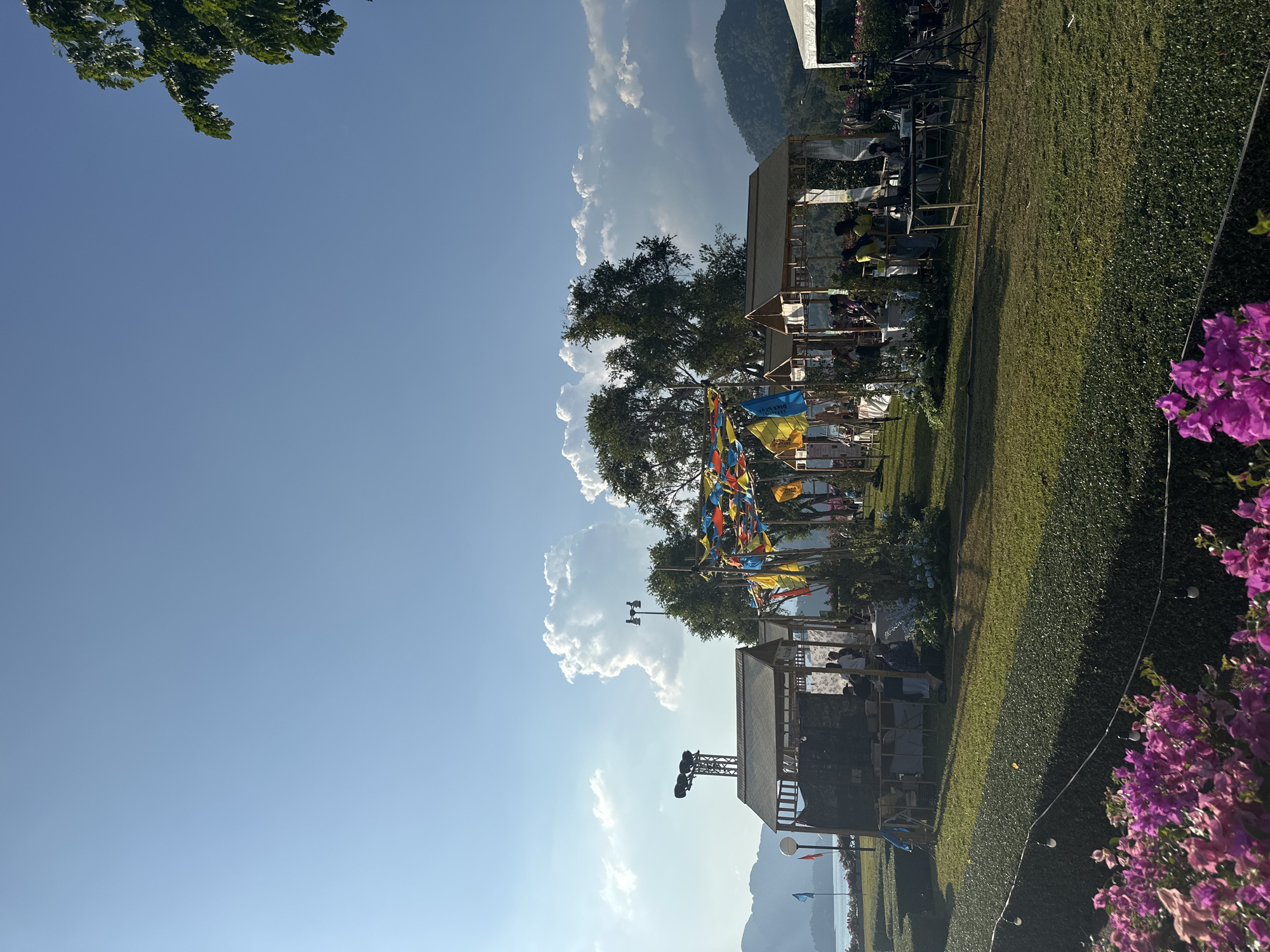 The image depicts an outdoor scene in Khao Phang, Thailand. The foreground includes vibrant purple bougainvillea flowers, transitioning into a green grassy lawn. In the midground, there's a structure with people seated, possibly at tables, alongside decorative flags. Behind this, trees and a clear blue sky with scattered clouds are visible. Mountains can be seen in the distant background. A lighting rig stands near one of the structures, suggesting an event or performance space. The image is oriented vertically, capturing a sunny day.