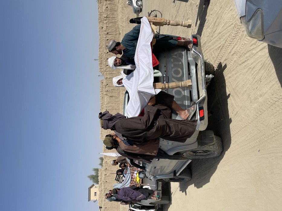 The image depicts an outdoor scene in Spin Boldak, Afghanistan, under a clear blue sky with bright daylight