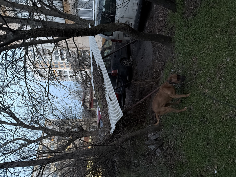 The image depicts an urban residential scene in Sofia, Bulgaria, likely during winter or early spring due to the leafless trees. A medium-sized, light brown, short-haired dog with a dark collar and leash is positioned in the lower-center-right, actively sniffing green ground cover. To the left of the dog, a pile of concrete and rock debris is partially visible. The mid-ground is dominated by a dilapidated, angled shelter constructed from corrugated metal sheeting, heavily covered with organic debris. Beneath and around this structure, several vehicles are parked, including a dark blue hatchback/MPV and a white panel van. Multiple bare-branched deciduous trees are scattered throughout the scene. In the background, visible through the tree canopy, are several multi-story, block-style residential apartment buildings with numerous windows and balconies, exhibiting light-colored facades. A smaller building with a reddish roof is also present in the distant background. The sky is clear and light blue. No human figures are visible.
