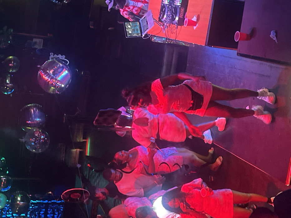 Inside a darkened club-like space, a group of people dressed in white outfits are gathered, illuminated by red and blue lighting. A DJ, wearing a colorful shirt and cap, is operating equipment on an elevated platform. Several disco balls hang from the ceiling, adding to the festive atmosphere. Plastic cups are scattered on the DJ's platform and on the floor, suggesting an active party environment.