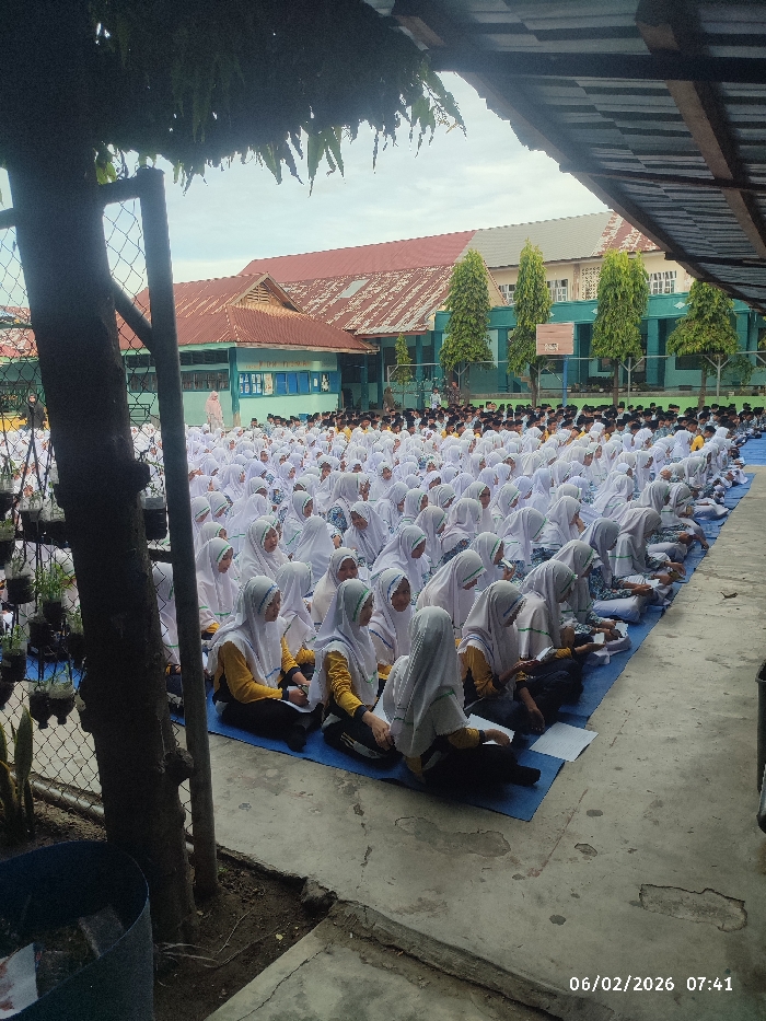 A large group of students, mostly girls wearing white headscarves and yellow and black outfits, are seated on blue mats in rows. Some boys are visible in the distance wearing different attire. They appear to be outside, possibly in a schoolyard. A building with a red and green roof is visible in the background. The scene is partially shaded by trees and a roof structure. A timestamp in the bottom right corner reads "06/02/2026 07:41".