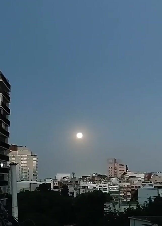 cityscape at dusk under a clear blue sky with the moon prominently visible