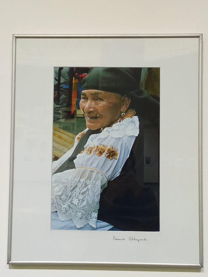 A framed portrait photograph depicts an elderly indigenous woman smiling, turned slightly to her right, looking towards the left