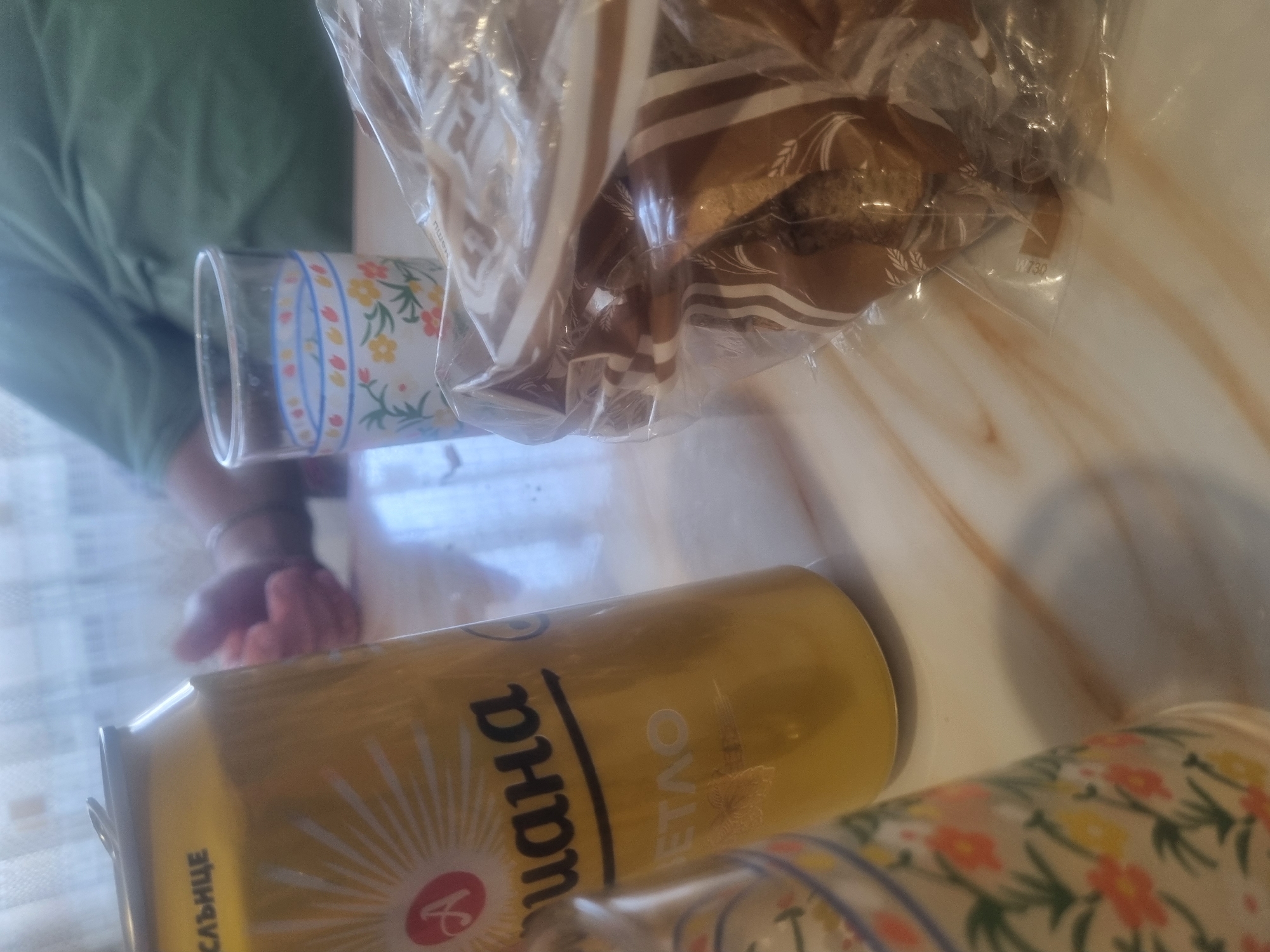 tabletop scene. A can of "Sun" sunflower oil with Cyrillic text is prominently displayed. There is a clear glass or cup with a floral pattern. A plastic bag containing what appears to be bread is also visible. A person's arm and hand are partly visible in the background. The location, General Toshevo, Bulgaria, is based on the Cyrillic inscription on the oil can.