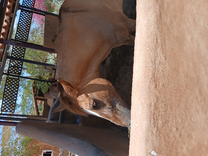 The scene is set outdoors in Guayacancito, Venezuela, under bright daylight. A light brown equine animal, likely a horse, is the primary subject, positioned in profile with its head lowered as if feeding from a dark pile of fodder or hay on the ground. The animal exhibits a uniform light brown coat, a lighter muzzle, and a prominent white blaze on its forehead; its mane is brown. In the immediate foreground, a textured, light brown concrete or stucco barrier partially obstructs the lower portion of the horse's body and features white splotches. Behind the animal, a rustic enclosure structure is visible, composed of dark support posts and a dark, lattice-patterned overhead section. To the left, a light brown stucco building with a small, dark, rectangular window is present, alongside a weathered, dark concrete pillar. The background displays sparse green trees and shrubs under a clear blue sky, with hints of pink and purple flowering foliage visible on the far right. No human subjects are present in the image.