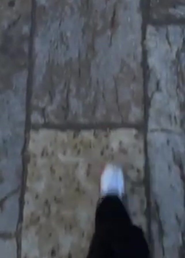 The video begins with a view of stone pavement from a first-person perspective, showing a person walking