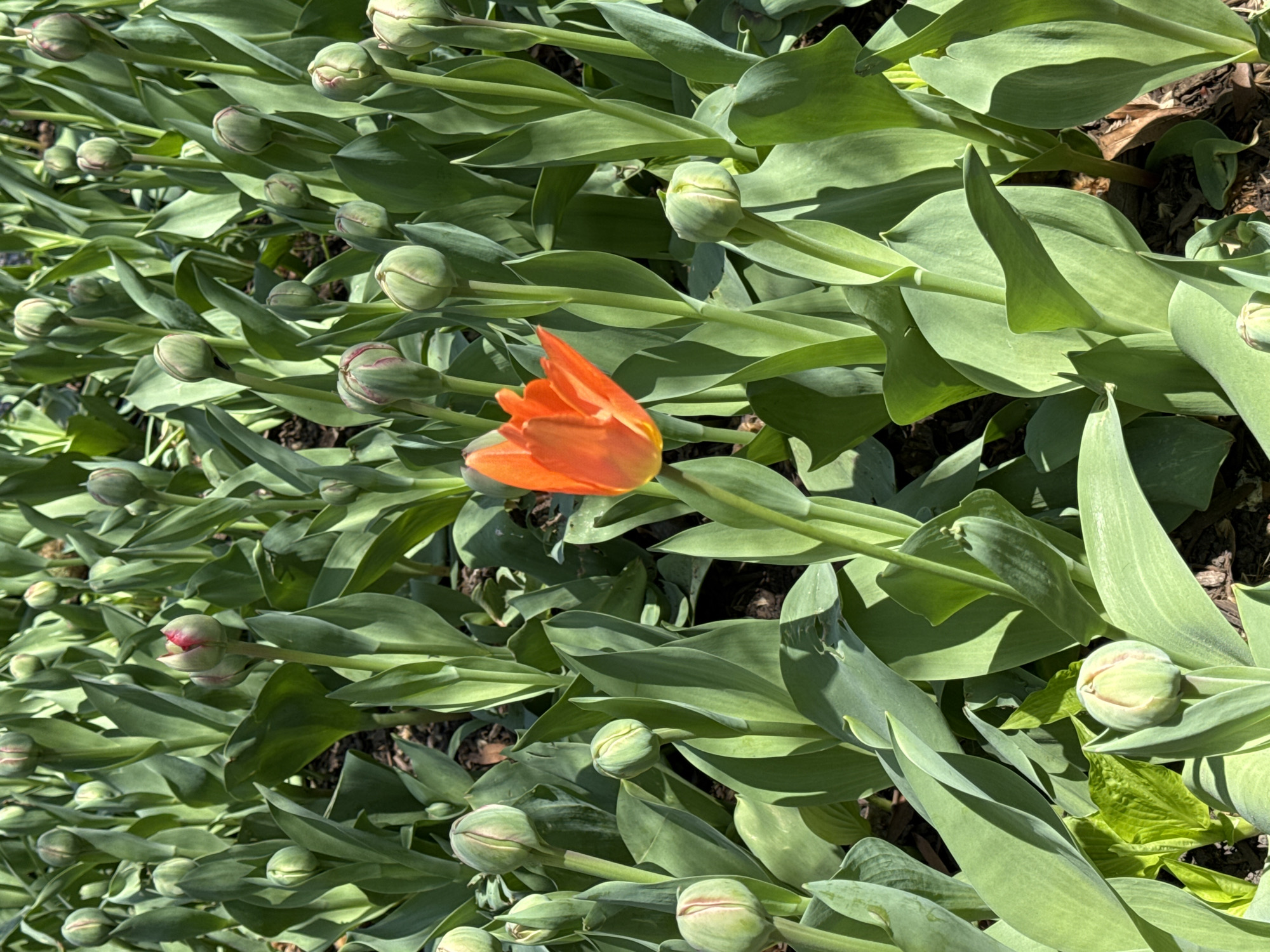 - "cluster of tulip plants, predominantly green leaves and unopened buds, with one orange tulip in partial bloom" by FM-EUJU83, licensed under CC BY 4.0