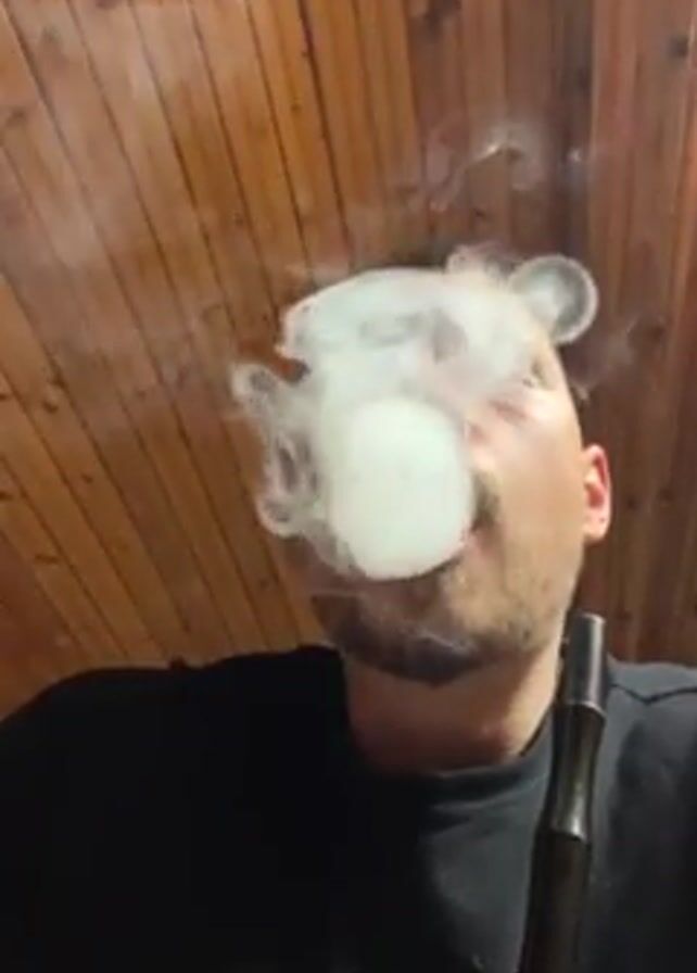 A man with closely cropped hair and a goatee is holding a hookah and blowing smoke rings at the camera
