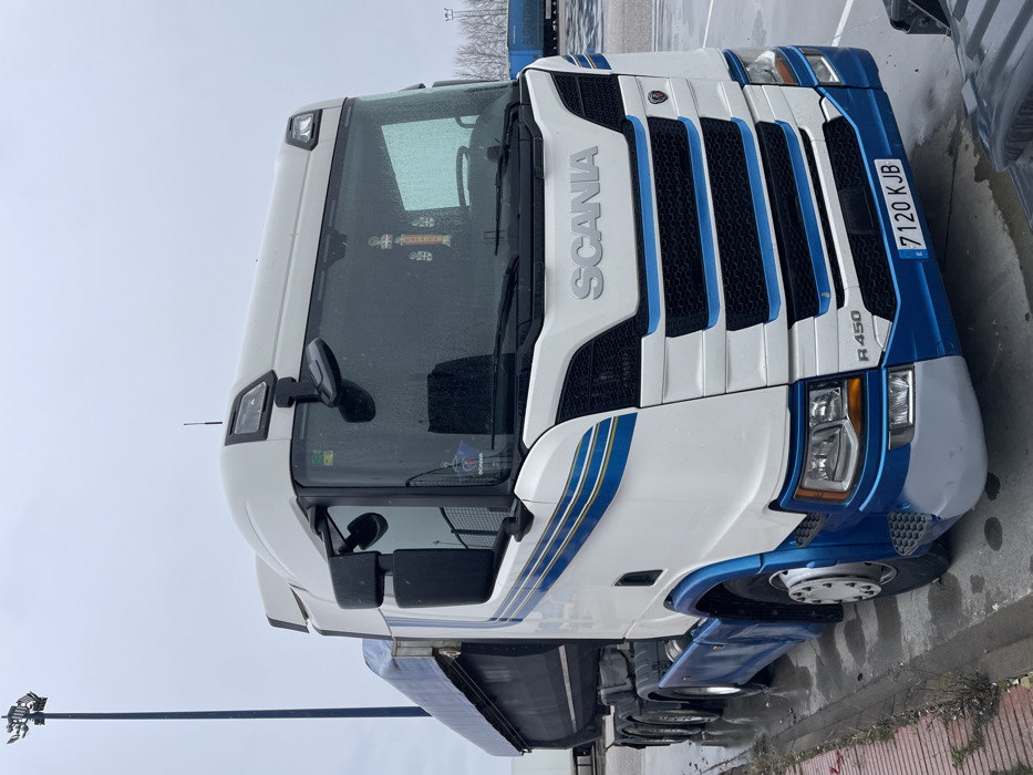 A white and blue Scania R450 semi-truck, featuring blue pinstripes and lower body accents, is parked on a wet asphalt surface
