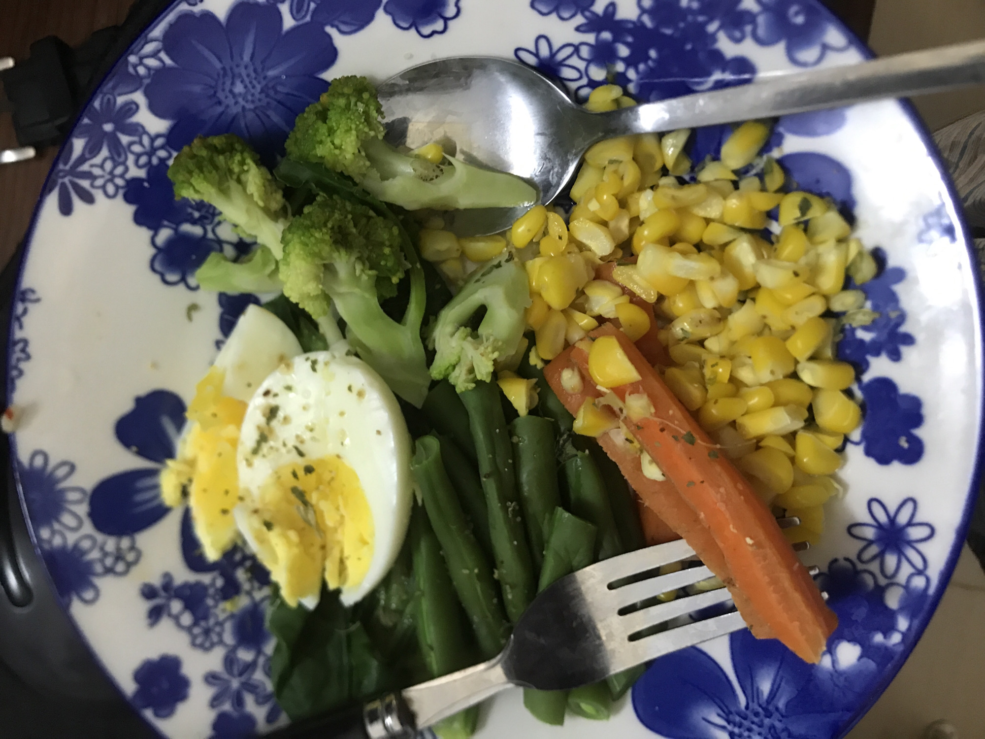 plate of food, consisting of broccoli, corn, carrots, green beans, and a sliced hard-boiled egg. The food is arranged on a white plate with a blue floral pattern. A spoon and a fork are also present on the plate. The location is not identifiable as Lhokseumawe, Indonesia. The presence of tableware suggests the food is intended for consumption. No people are visible in the image.