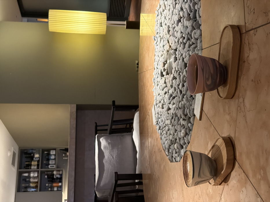 The image displays a uniquely decorated wall with round decorative stone elements, upon which two decorative bowls rest on wooden platforms. One bowl is pink and gray, the other is white and gray. In the background, a chair with a white cushion is visible near a wall with a lighted yellow lamp above. A wine rack is built into the wall on the lower left.
