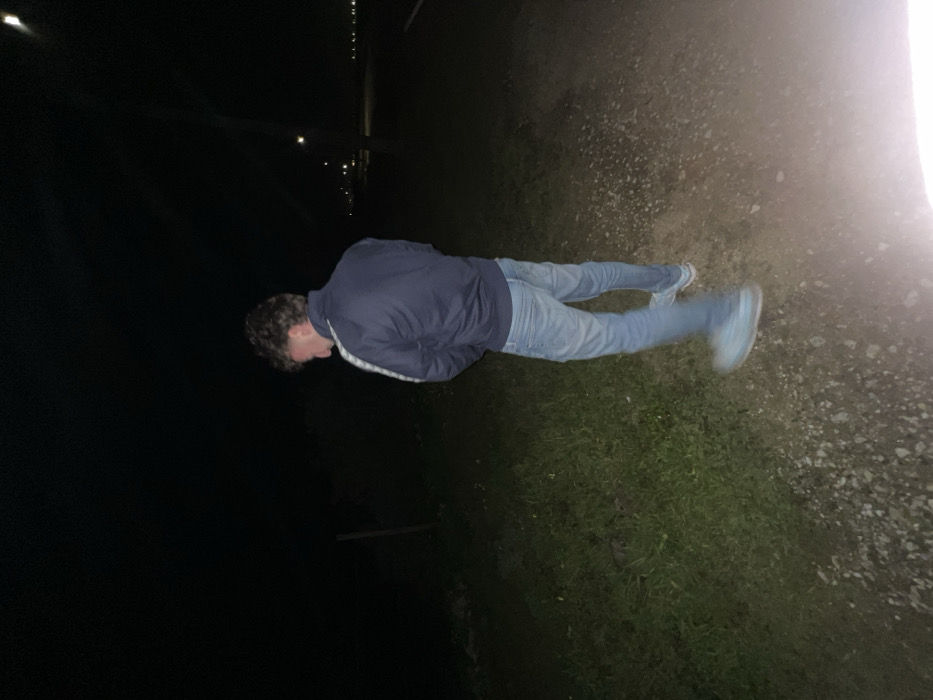 A person in jeans and a blue jacket lies on a patch of ground, which appears to transition from grassy to gravel-like texture. The photo is taken at night or in dim light, with streetlights dimly visible in the background. The person's face is tilted down. A bright light source is at the top right edge, casting a glare.