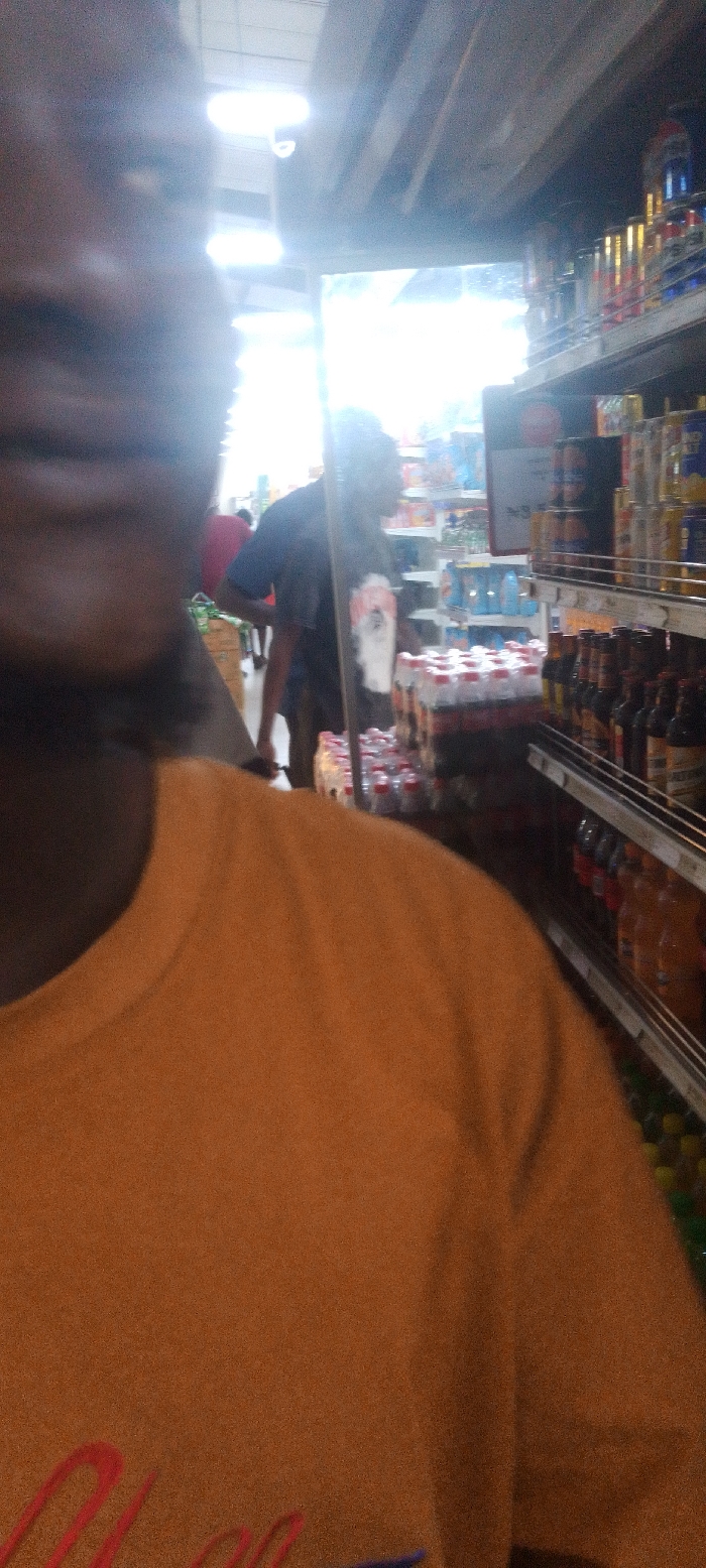 person wearing a brown shirt standing in a store aisle in New Karu, Nigeria. The person is looking at a man in a dark blue shirt who is standing in the aisle, in front of a refrigerated display case containing bottles of soda. The store aisle is lined with shelves stocked with various grocery items, including canned goods and beverages. The lighting in the store is fluorescent and the ceiling is concrete. The store is likely to be a supermarket or a grocery store. The image was taken at a location in New Karu, Nigeria, with coordinates (latitude: 8.991, longitude: 7.57).