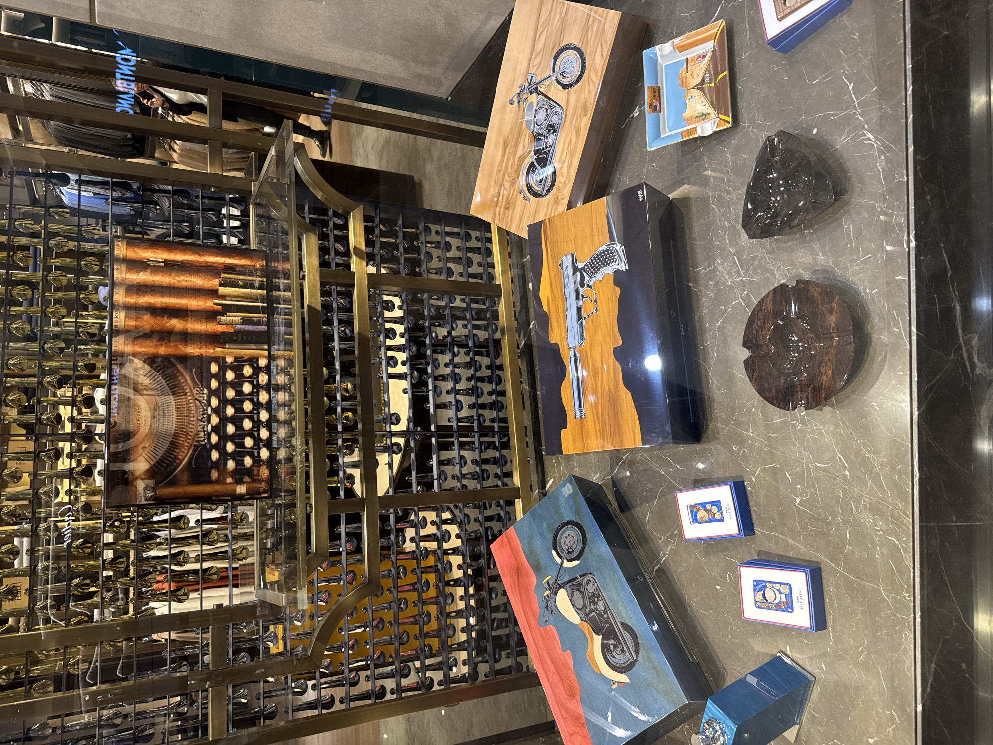 table with various objects on it, including decorative boxes with images of motorcycles and a gun, ashtrays, and small boxes. The table is located near a large wine rack filled with bottles. The location is Sarıyer, Turkey, as indicated by the reflection in the upper left of the image.