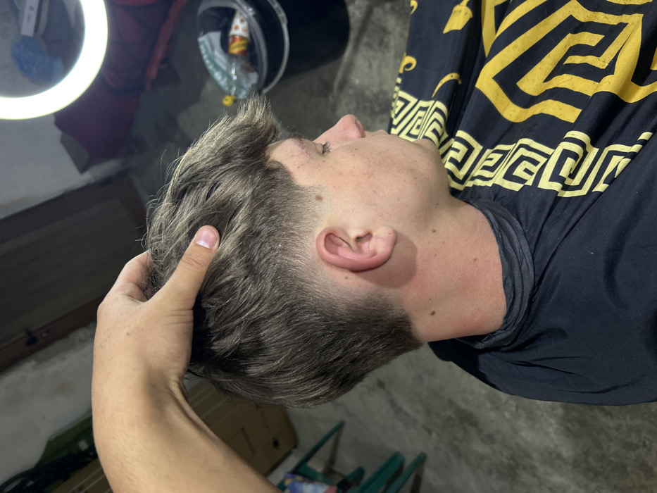 - "A young male with light brown, textured hair is seated in a dimly lit indoor environment, identified as Hvostiane, Bulgaria, receiving a haircut" by FM-asf5k1, licensed under CC BY 4.0