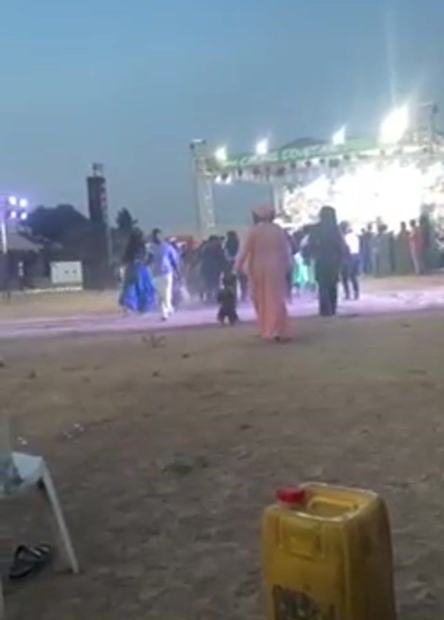 The video captures a bustling outdoor event at dusk, set on a sandy, dusty ground. A stage, adorned with bright lights and the words "CHARMS COUTURE 2023," is the focal point, surrounded by a crowd of people. These individuals are of various ages and dressed in a mix of traditional and modern attire, including long gowns, casual shirts, and patterned trousers. Movement abounds as people walk, dance, and interact with each other. In the foreground, a white plastic chair and a yellow jerrycan are visible. The overall atmosphere suggests a festive or celebratory gathering.