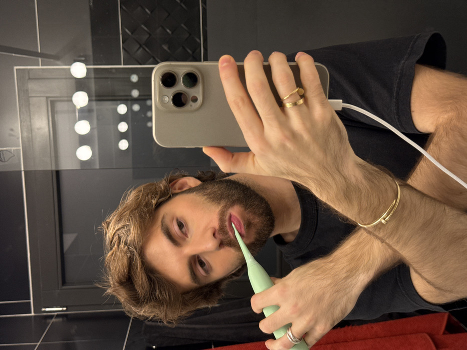 A man is taking a selfie while brushing his teeth in a bathroom. He is using a light green electric toothbrush. The reflection shows a mirror with a row of lights and dark tiled walls. He is wearing a black t-shirt and jewelry, including a gold bracelet and rings. His phone is charging with a white cord.