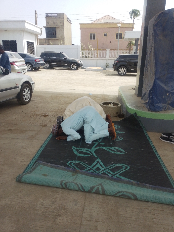 The image depicts an outdoor scene in Dorayi, Nigeria, during daylight. In the foreground, two individuals are prostrating on a dark green mat with light green patterns, engaged in prayer. The front individual wears a light blue traditional garment and a patterned cap, with hands and face on the mat. The second individual, partially obscured behind the first, wears a light-colored garment and is also in a prayer posture. A pair of black slip-on shoes rests near a concrete pillar on the right. The ground is a light gray concrete surface, and a small, circular concrete well is visible. In the midground, several vehicles are present, including a silver sedan, a dark gray sedan, a black SUV, and another black SUV partially visible on the right next to a structure covered by a dark blue tarp. A person in a blue shirt is visible near the silver sedan on the left. The background features various buildings: a white-facaded building on the left, a multi-story, darker-toned building behind it, and a prominent two-story light peach-colored residential building with a reddish-brown roof and a white fence in the center-right. A single palm tree rises behind this peach building. Power lines are visible against the clear sky.