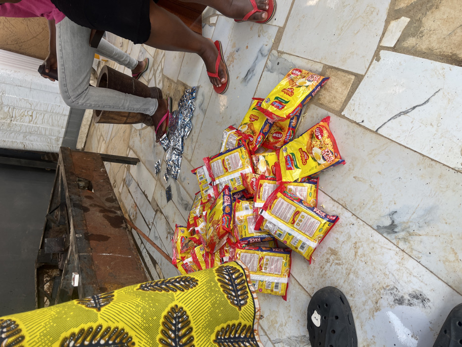The scene is located in an outdoor or semi-outdoor area in Zawan, Nigeria, characterized by a light-colored, irregularly tiled floor exhibiting cracks. In the foreground, a substantial pile of approximately 30-40 individual "Indomie Super Pack Chicken Flavour" instant noodle packages, predominantly yellow and red and each marked "₦400," lies scattered on the floor. To the left, the lower section of a person is visible, clad in a vibrant yellow patterned fabric and a black clog on their left foot. Behind the noodle packages and partially obscured by the person in yellow, a rusty, dark-colored metal cooking stove or stand is positioned, bearing a small white object on its top surface. To the right, two individuals are partially depicted. One person is seated, wearing light grey jeans and pink flip-flops, with their legs positioned around a tall, dark wooden mortar. Adjacent to this individual, another person's lower legs and feet are visible, wearing a dark garment and red flip-flops. Numerous crumpled silver foil wrappers are strewn on the tiled floor near the seated individuals and the mortar. The background includes sections of textured white and dark walls.