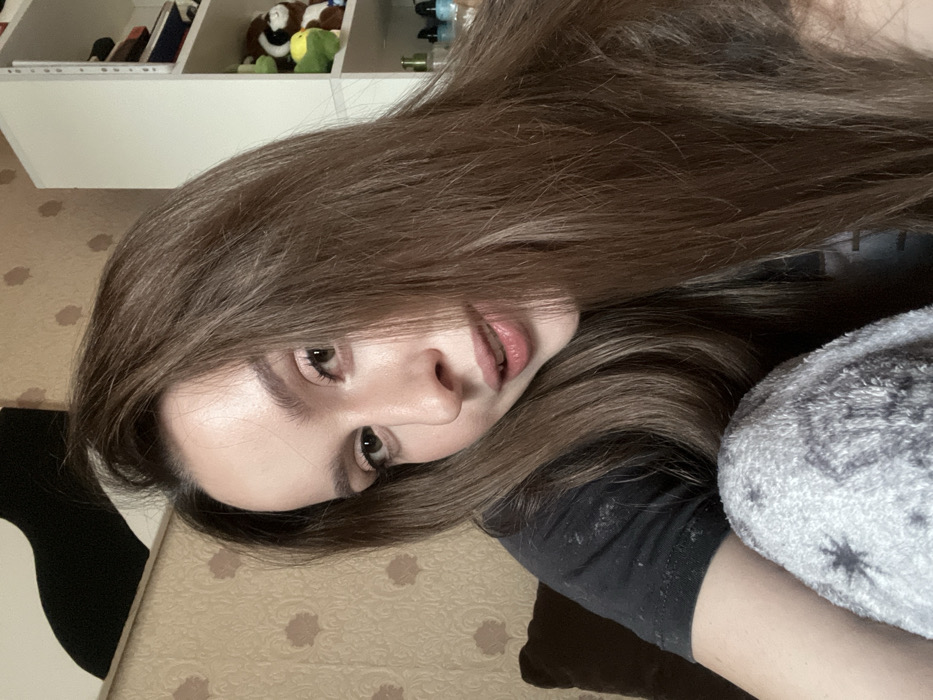 An indoor, close-up image features a young adult female with long, straight, brown hair, looking directly at the camera with her lips slightly parted