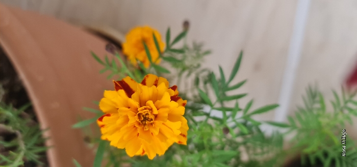 A vibrant marigold takes center stage with its golden-yellow petals, uniquely marked with reddish-brown stripes. Another marigold blooms softly in the background, amidst a lush display of green, feathery foliage. Part of a brown clay pot is visible to the left. The overall composition brings to mind natural beauty.