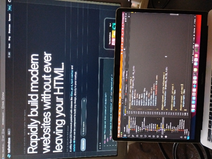 The scene is a workspace located in Kikuyu Township ward, Kenya. It features a two-monitor computer setup. The upper, larger monitor displays a dark-themed website, identifiable by the "tailwindcss" logo and the prominent text "Rapidly build modern websites without ever leaving your HTML." and a description of a "utility-first CSS framework." The lower display is a silver MacBook Pro laptop, positioned in front of the external monitor. Its screen shows a dark-themed Integrated Development Environment (IDE), likely Visual Studio Code, displaying CSS code related to `#header-carousel` elements, with a file navigation pane visible on the left side. The top right corner of the laptop screen indicates the date as "Tue 13 Aug 2019." A black cable is visible on the desk to the left of the laptop, and a white cup or mug is partially visible on the right side of the desk. The desk surface is dark. No individuals are present in the image.