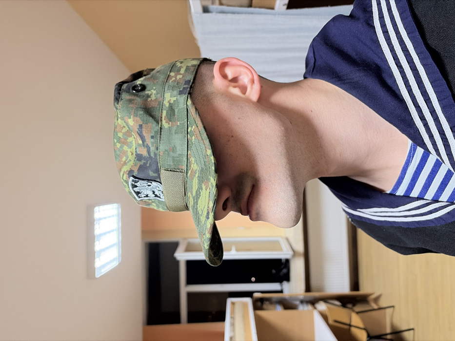 The image displays a male individual in a dormitory-style room, viewed in profile from the right side, with the room illuminated by overhead fluorescent lighting. The subject's face is largely obscured by the brim of a digitally camouflaged patrol cap, which features a patch resembling the Bulgarian coat of arms (a silver lion rampant on a dark shield) centered on its front. The cap is predominantly green, brown, and black. The individual wears a dark blue sailor-style collar with three white horizontal stripes, worn over a blue and white horizontally striped undershirt (telnyashka). His hair is closely cropped on the sides. In the background, the walls are painted a light peach or orange color. A square, recessed LED light fixture is active on the white ceiling. To the left, a light-colored wooden bunk bed structure or shelving unit is partially visible, with a wooden chair tucked beneath a desk surface. In the mid-ground, a white-framed window or door is open, revealing a dark exterior suggesting nighttime, with a faint distant light source. To the right, partially visible, is another bed frame or cabinet draped with a light blue or white sheet. The floor is light-colored wood or laminate. Based on the uniform insignia, the naval attire, and the dormitory environment, the scene is located in Varna, Bulgaria, specifically within a military facility such as the Nikola Vaptsarov Naval Academy.