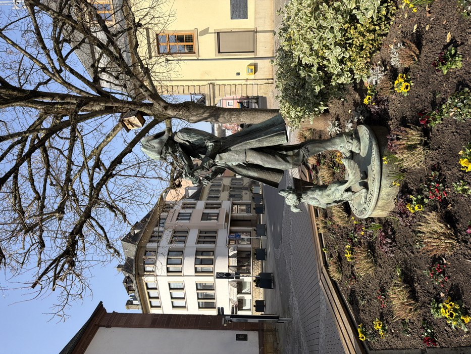 - "The image depicts a bronze statue of a man playing a violin, accompanied by a dog, situated in a circular garden bed in the city of Grevenmacher, Luxembourg" by FM-3ujak2, licensed under CC BY 4.0